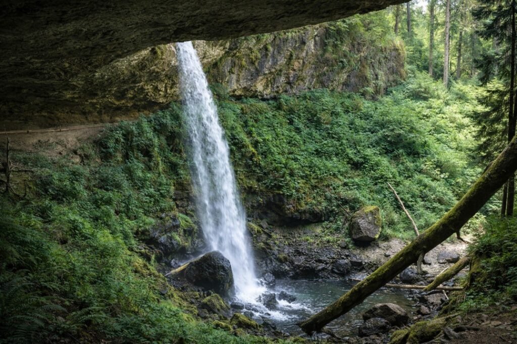 North Falls plunges over layers of Columbia River Basalt, similar to other waterfalls in the park. Over time, erosion has carved a deep recess behind the waterfall, allowing visitors to walk partially behind the cascade. The surrounding canyon walls expose multiple lava flows stacked atop one another, offering a clear look at the volcanic history of the region.